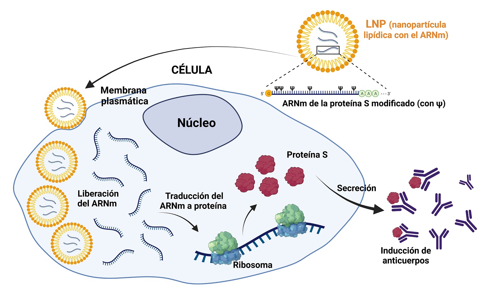 En el caso de las vacunas de ARNm se introduce en el cuerpo una molécula de ARN mensajero que contiene las instrucciones para fabricar una proteína del virus, pero no todo el virus, por lo que no puede causar la enfermedad. Una vez dentro de las células, el ARNm es «leído» por los ribosomas, que son las fábricas de proteínas de la célula. Dichos ribosomas utilizan la información del ARNm para producir la proteína viral, la cual es fabricada por las células del propio organismo y reconocida como extraña por el sistema inmunológico. Esto desencadena una respuesta inmune: el cuerpo produce anticuerpos y activa células defensivas (como los linfocitos T) para combatir lo que percibe como una amenaza.